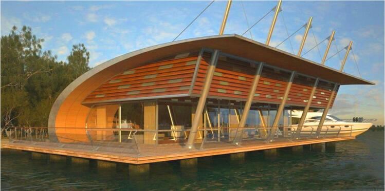 水上建筑設計適宜采用通透的建筑外殼,輕盈的建筑造型,因此該水上運動中心建筑設計采用現(xiàn)代風格,采用鋼架結(jié)構(gòu)的形式,建筑材料專用采用鋼構(gòu)架、防腐木和玻璃,屋頂設計采用流線型,挑出屋頂?shù)闹雍弯摻z拉線與現(xiàn)狀水上高爾夫的張拉膜結(jié)構(gòu)形成統(tǒng)一風格。